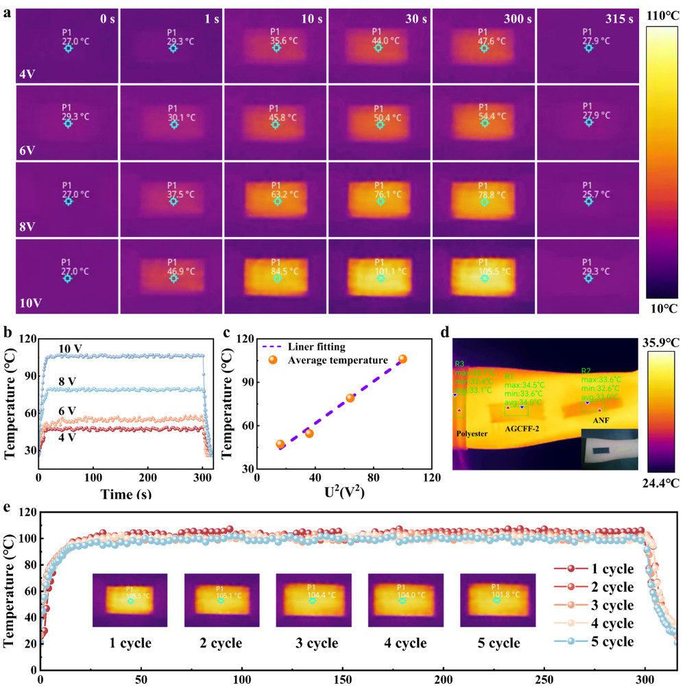 芳纶纳米纤维/石墨化多壁碳纳米管复合纤维织物的焦耳加热性能:(a)不同电压下芳纶纳米纤维/石墨化多壁碳纳米管复合纤维织物的红外热像图和;(b)不同电压下芳纶纳米纤维/石墨化多壁碳纳米管复合纤维织物温度随时间变化曲线;(c)不同外加电压下的平均温度及其U2的线性拟合;(d) 芳纶纳米纤维/石墨化多壁碳纳米管复合纤维织物的散热情况;(e) 芳纶纳米纤维/石墨化多壁碳纳米管复合纤维织物在10 V外加电压下连续5次循环的温度曲线。