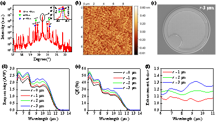 图2 InAs/GaSb超晶格长波红外探测器的表征:(a)外延材料的高分辨X射线衍射(HRXRD)表征;(b)外延材料的原子力显微镜(AFM)表征;(c)探测器的扫描电子显微镜(SEM)表征;(d)探测器的响应度谱;(e)探测器的量子效率谱;(f)探测器的光响应增强因子谱
