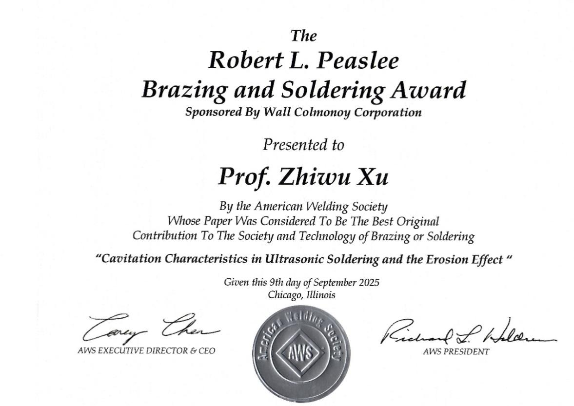 近日,材料结构精密焊接与连接全国重点实验室许志武、闫久春教授团队凭借在超声波钎焊领域的突破性研究,荣获美国焊接学会(AWS)2025年度“Robert L. Peaslee Brazing and Soldering Award”。这一荣誉是该团队继2021、2024年后第三次斩获该奖项,再度获得国际焊接权威机构的认可,标志着我国在超声波钎焊基础理论与应用研究方面持续保持国际领先水平。